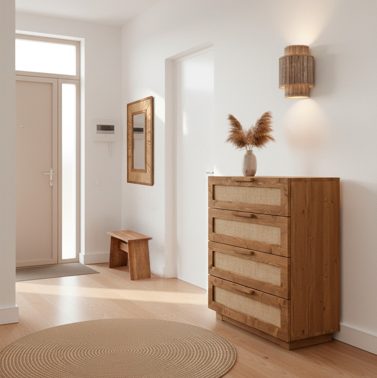 Cómoda de madera maciza con cuatro cajones de rafia natural (80x42x95cm)