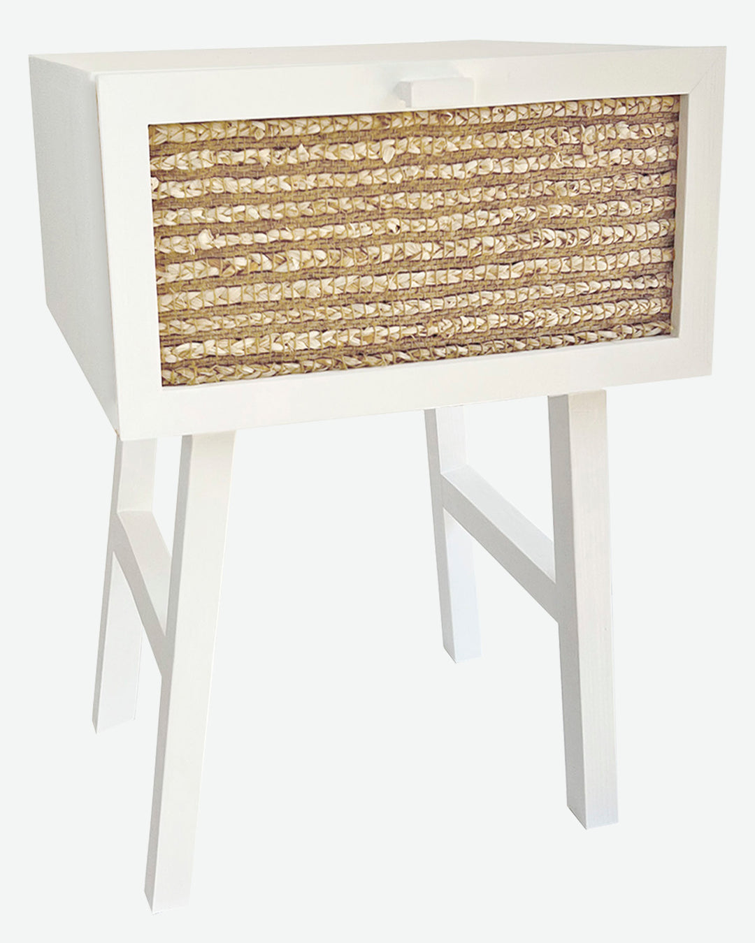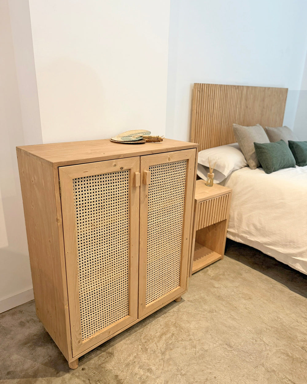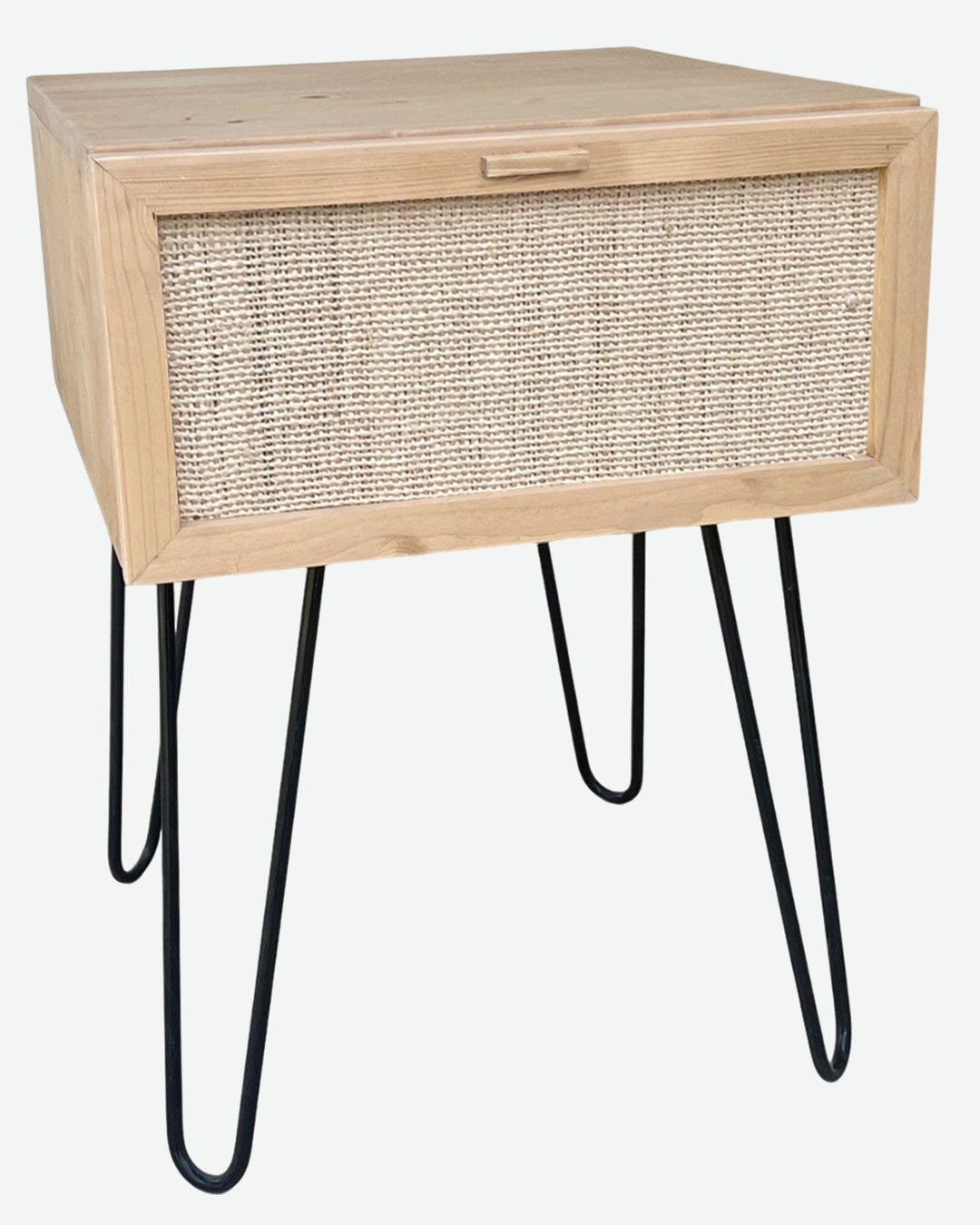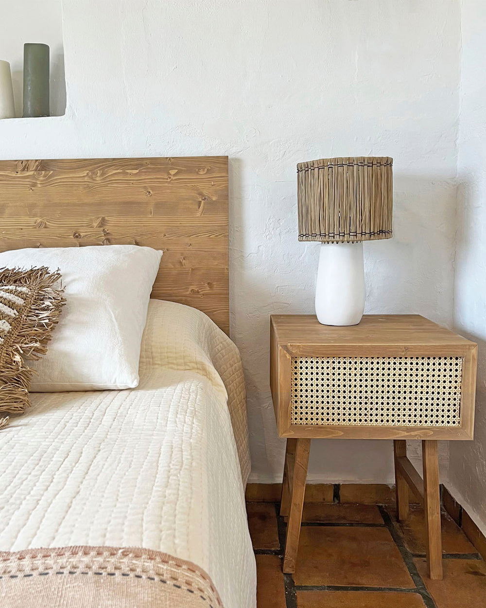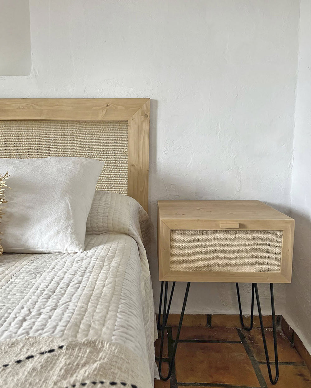 Mesita de noche de madera con rafia natural (varios colores disponibles)