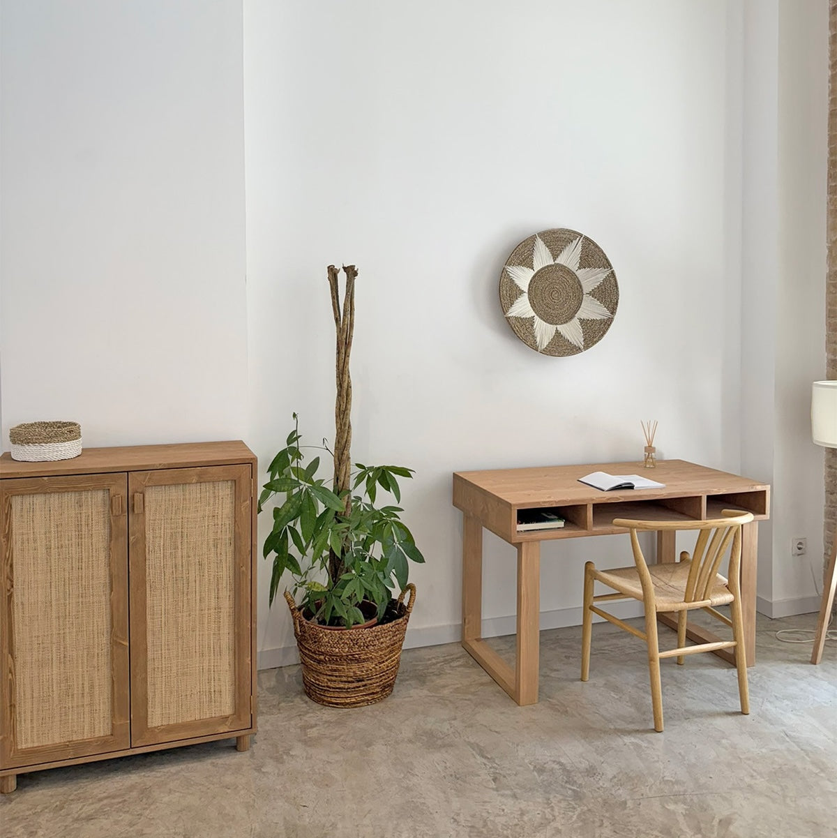 Mesa de recibidor de madera con 2 cajones y balda de rafia