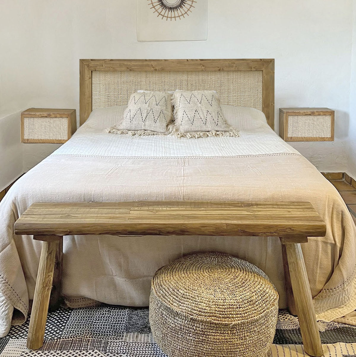 Mesita de noche de madera maciza con dos cajones de rafia natural y estante