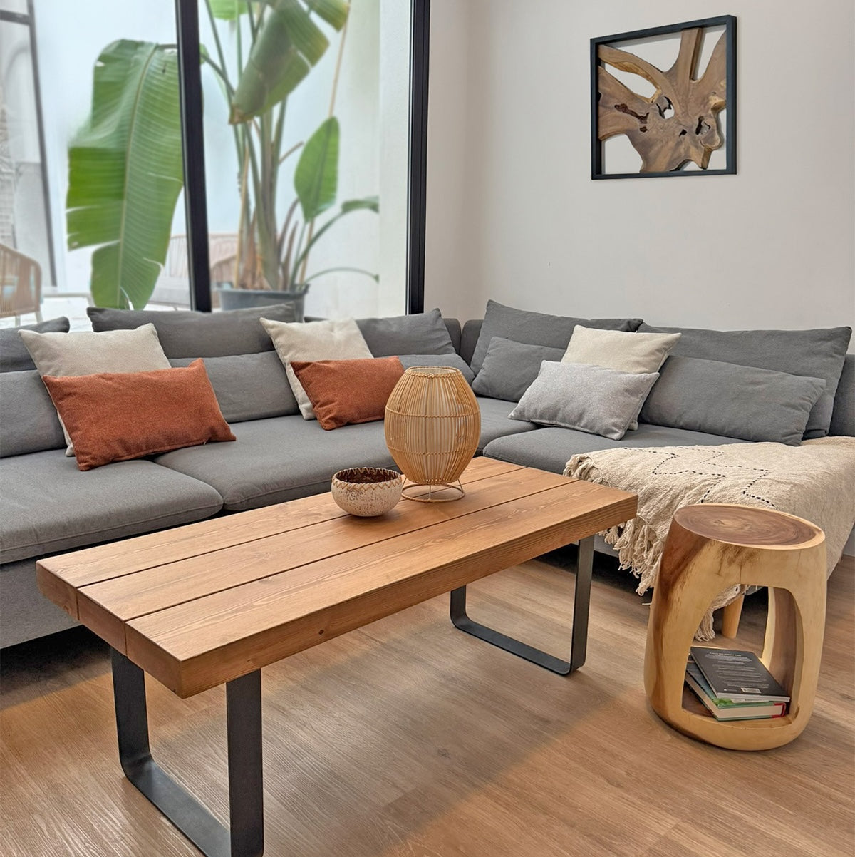 Mesa de centro de madera maciza con tablones y patas de hierro (2 tamaños: 100 y 120cm)