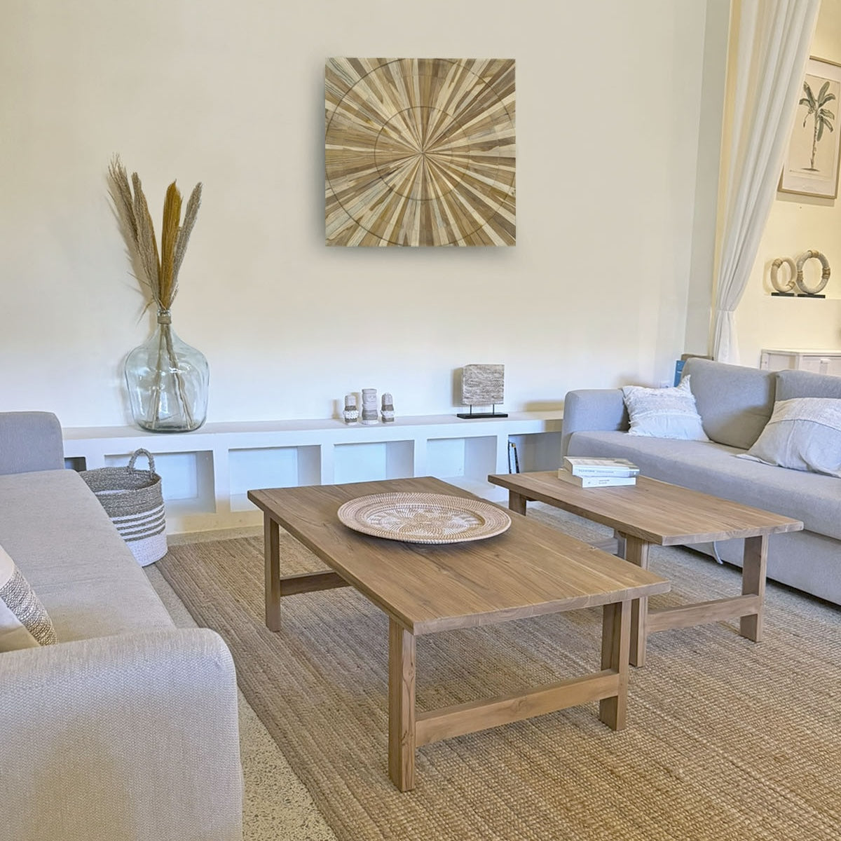 Todas nuestras mesas de centro están realizadas artesanalmente con madera de teca de gran calidad , por lo que cada mesita de centro tiene un encanto natural muy especial y exclusivo. Cada pieza de madera ha sido cuidadosamente seleccionada para garantizar una calidad superior y una bella natural inigualable. Las puedes colocar como pieza central en tu comedor , como mesa auxiliar delante del sofá o para crear un pequeño rincón de lectura .