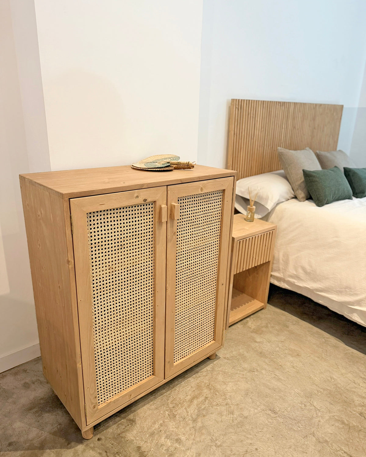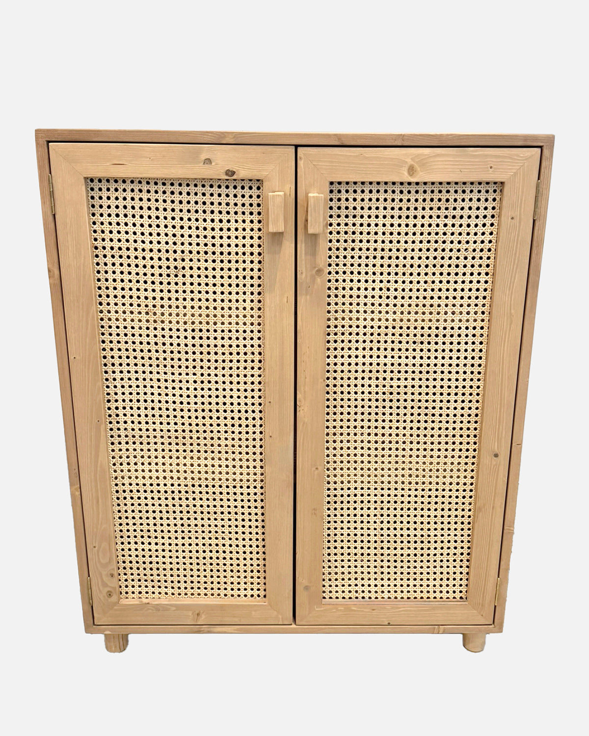 Nuestro mueble aparador Atlas está realizado artesanalmente en España, con madera maciza de abeto que garantiza la máxima resistencia y durabilidad. El frontal de las dos puertas es de ratán, que le da un toque muy natural y atractivo. El ratán es una fibra natural similar al mimbre que aporta textura, ligereza visual y un encanto artesanal único. Sus preciosos tiradores y las patas redondas de madera le dan un toque exclusivo muy original. En su interior, cuenta con dos baldas de madera muy útiles y funcionales; perfectas para mantener tus accesorios de casa organizados.