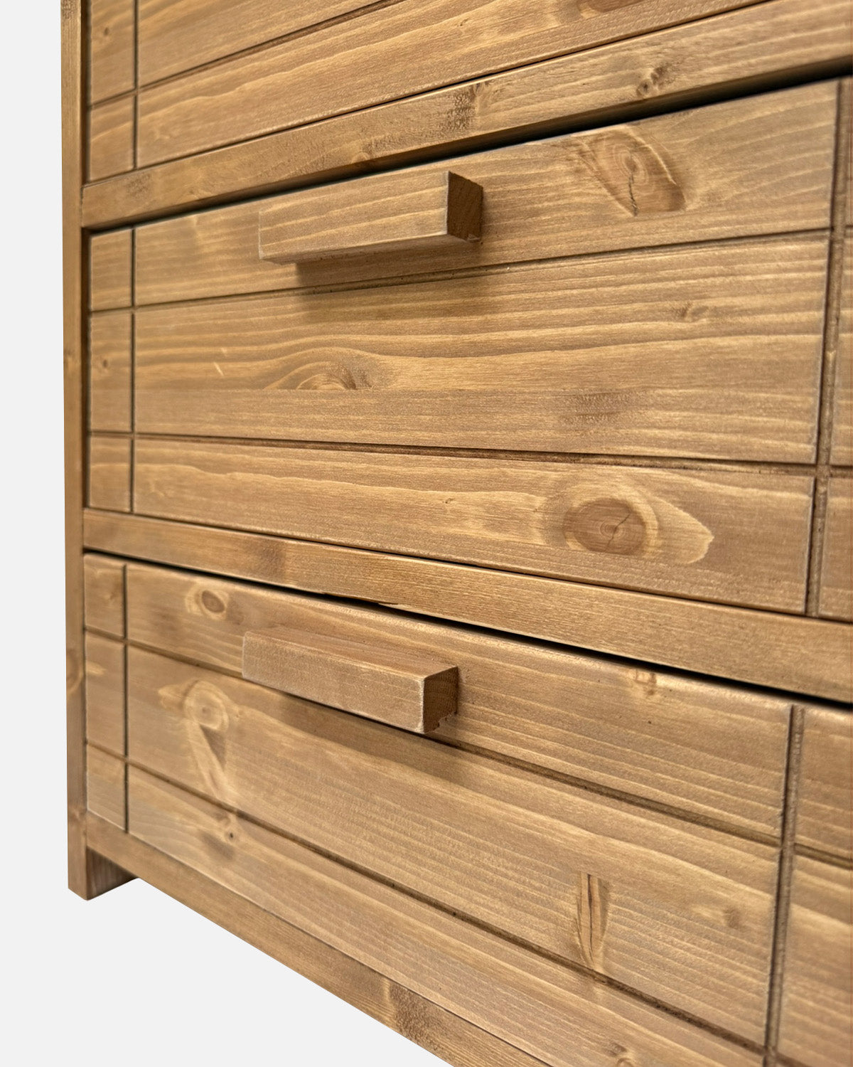 Está realizada artesanalmente en España con madera maciza de abeto y de origen sostenible; garantizando así durabilidad y un acabado de alta calidad. El aspecto natural de la madera realza las vetas y texturas únicas de cada pieza, aportando autenticidad y carácter al espacio. Puedes personalizarla eligiendo el tono de madera que más te guste y se adapte al estilo decorativo de tu hogar.