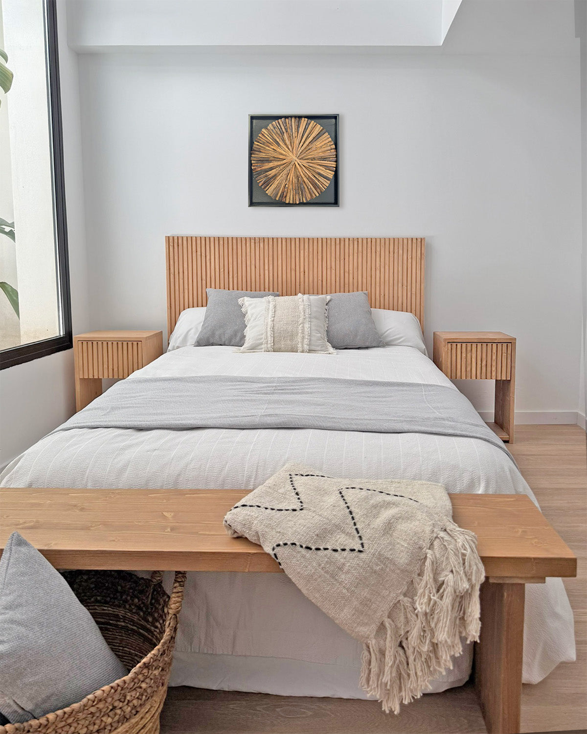 Se adapta a una gran variedad de estilos decorativos: desde dormitorios nórdicos o mediterráneos hasta estancias más rústicas o minimalistas. Su estructura robusta asegura una durabilidad excepcional que crea un efecto visual muy atractivo tanto si se combina con otros muebles de madera como si se utiliza para contrastar con textiles suaves o paredes neutras.