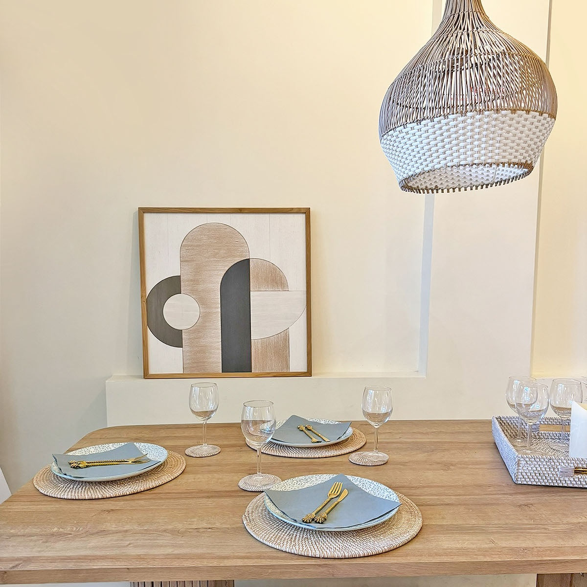 Bandeja cuadrada de ratán en tono blanco y natural