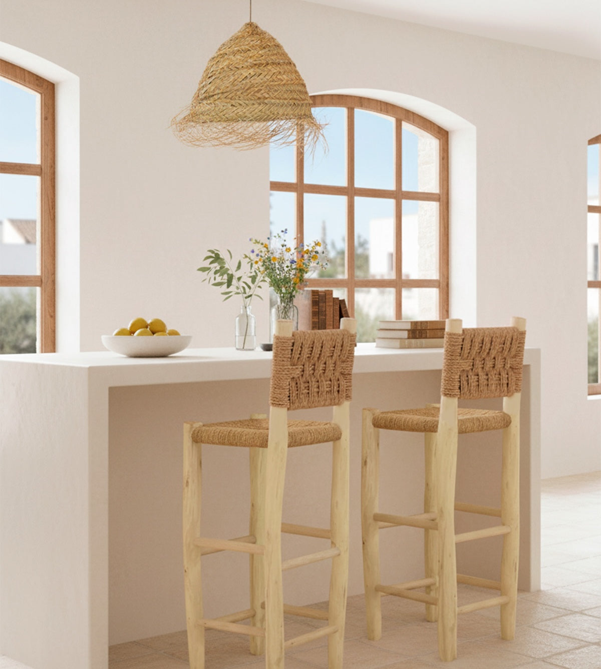 Taburete alto con asiento y respaldo de fibra natural