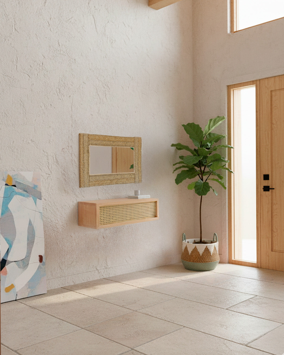 Le miroir horizontal Safor a une forme rectangulaire et peut être posé sur un meuble ou mur. Il est à la fois fonctionnel et décoratif, car il possède une grande surface vitrée et un cadre extérieur recouvert d'alfa qui apporte élégance et joie à n'importe quel coin de votre maison.