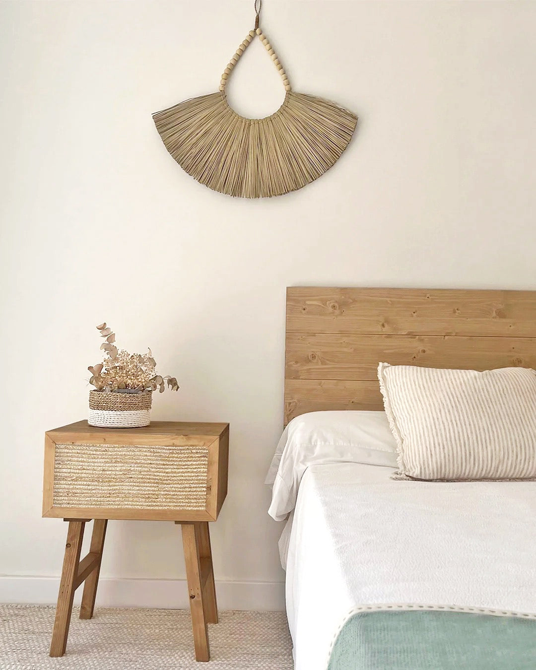 Tête de lit en bois avec des lignes horizontales en raphia naturel