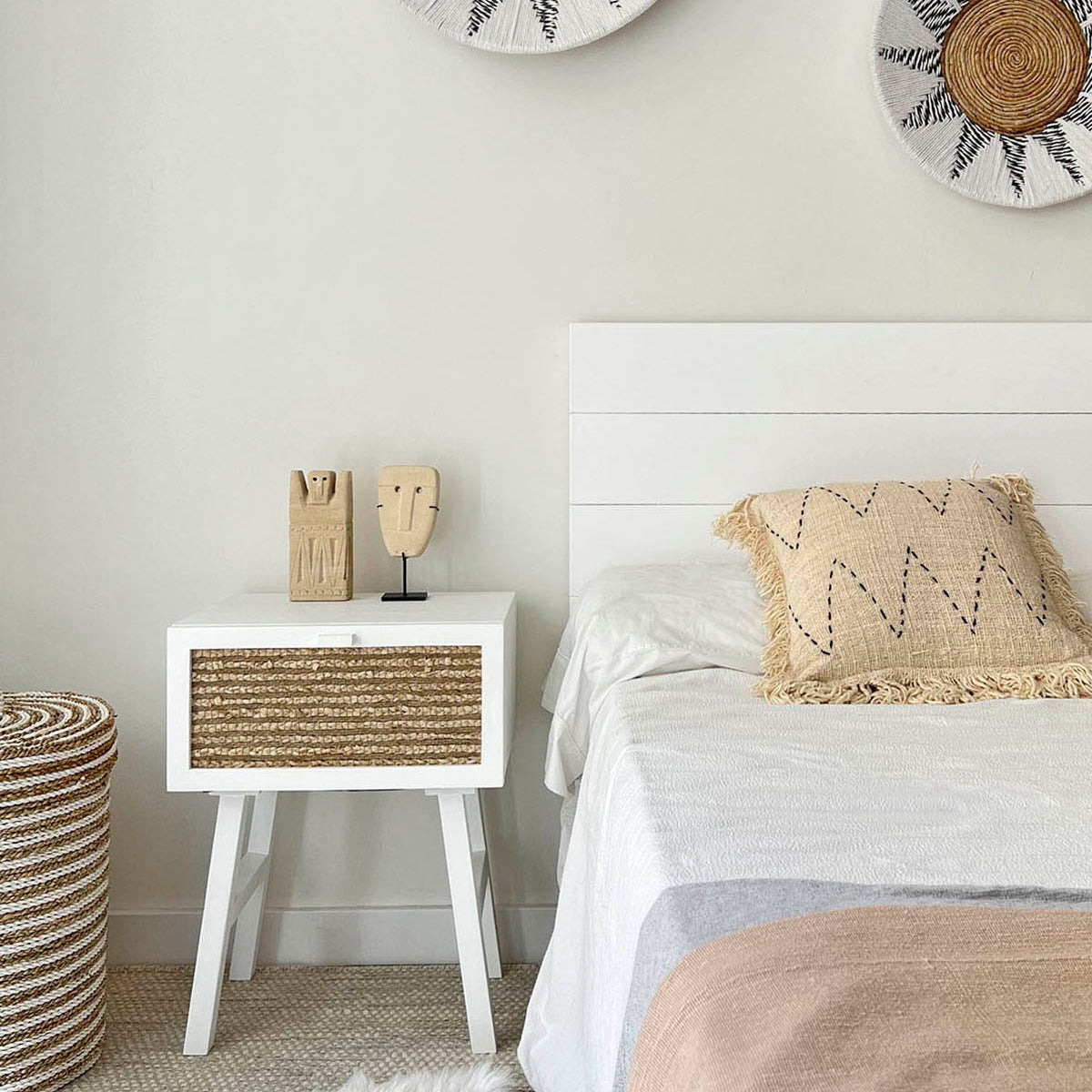 Table de chevet en bois avec raphia naturel