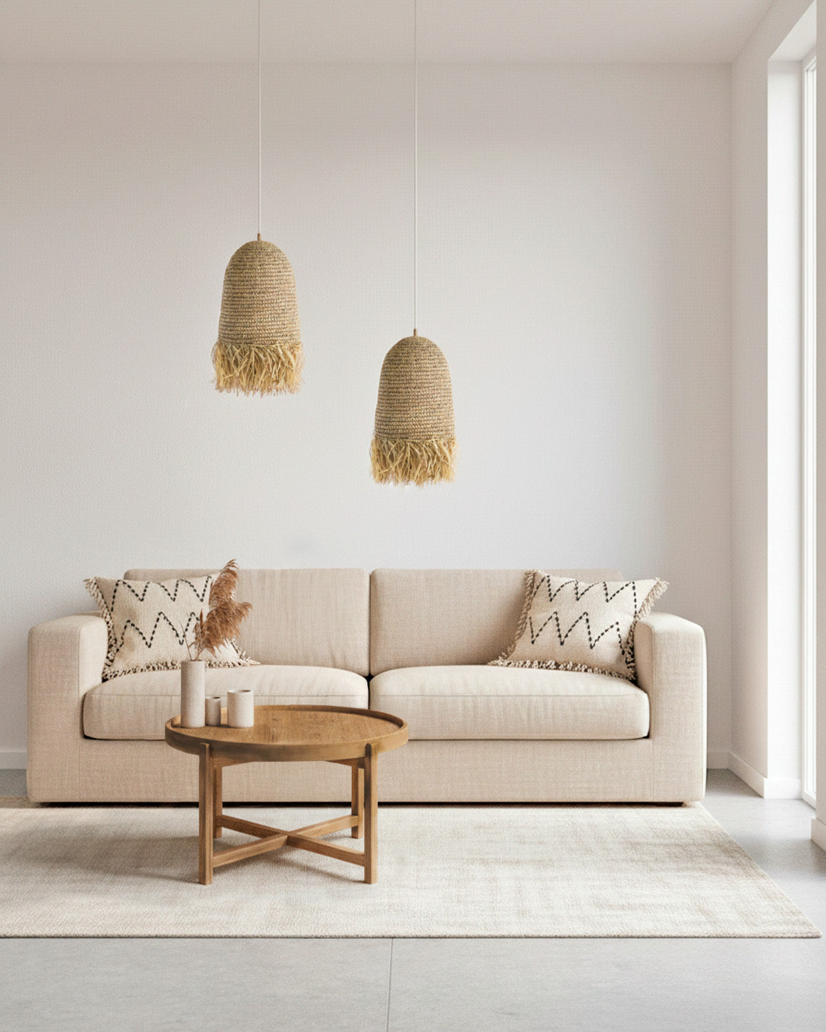 La lampe Meno est tout simplement magnifique. Son corps en fibres naturelles de sisal en combinaison avec ses franges en rafia naturelle illuminera, vivifiera et apportera de la joie à n'importe quel foyer.
