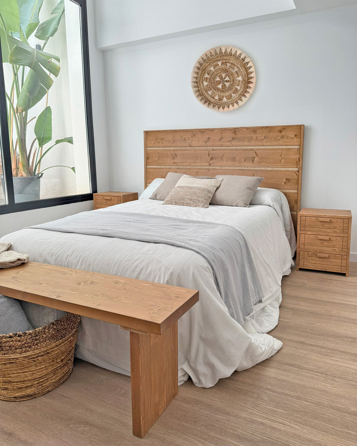 Está realizado artesanalmente en España con madera maciza de abeto y de origen sostenible; garantizado así durabilidad y un acabado de alta calidad. Puedes elegir el tono de la madera para que se adapte a tus gustos y al estilo decorativo de tu dormitorio. Desde tonos claros como el blanco, intermedios similares al roble o tonos de madera más oscuros. También podrás elegir el tamaño del cabezal, según las dimensiones de tu cama, ya sea individual o cama de matrimonio.