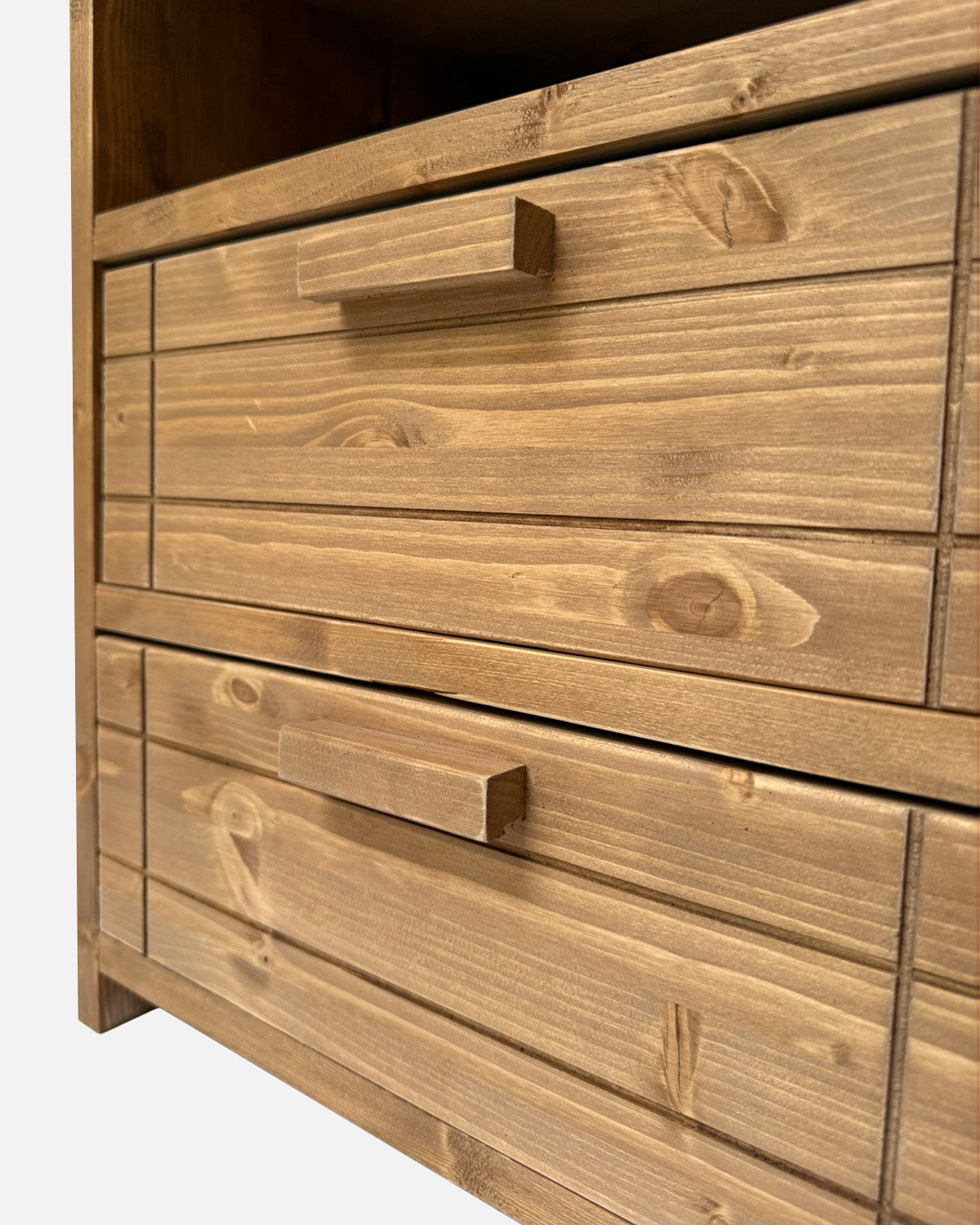 Está realizada artesanalmente en España con madera maciza de abeto y de origen sostenible; garantizando así durabilidad y un acabado de alta calidad. El aspecto natural de la madera realza las vetas y texturas únicas de cada pieza, aportando autenticidad y carácter al espacio. Puedes personalizarla eligiendo el tono de madera que más te guste y se adapte al estilo decorativo de tu hogar.
