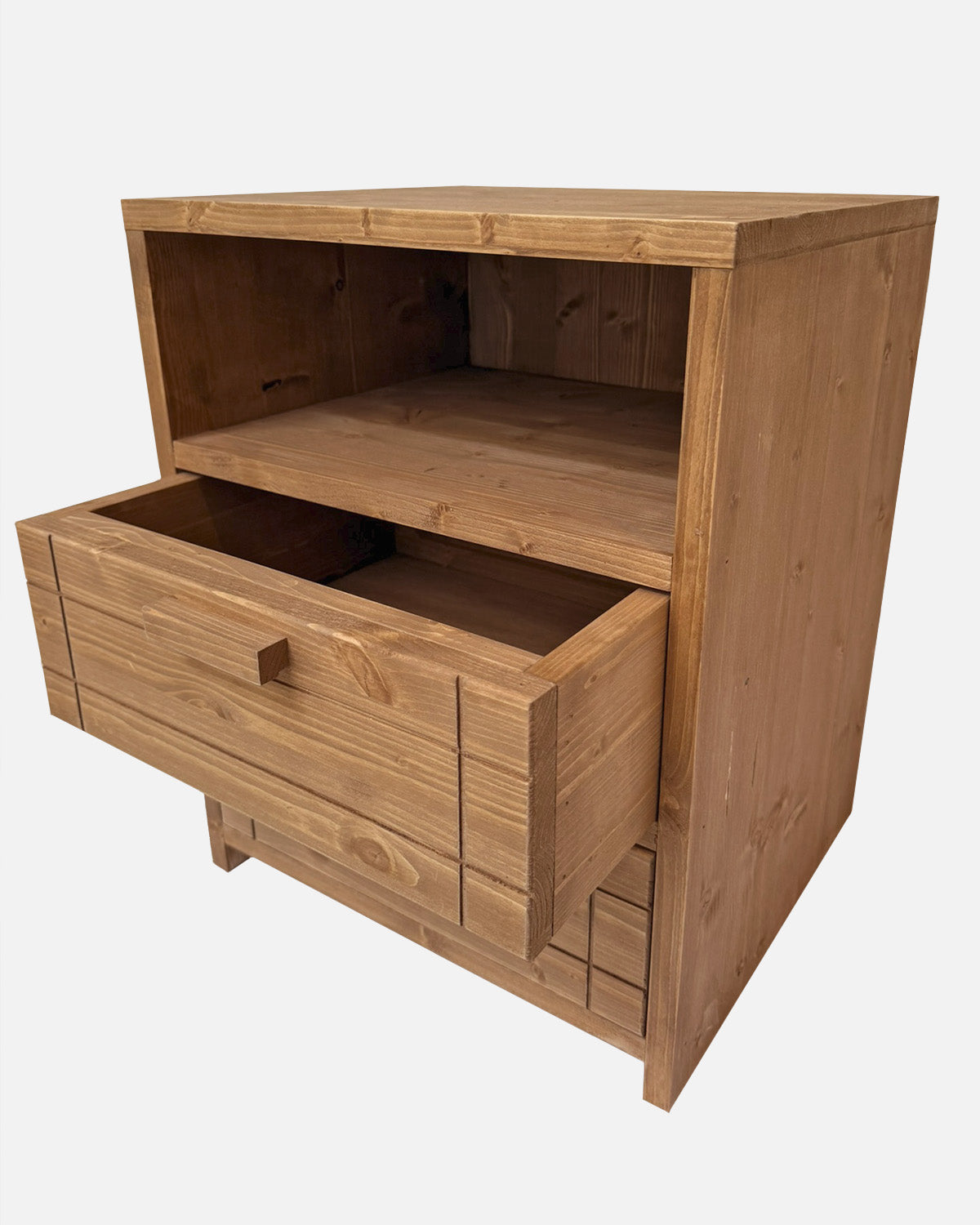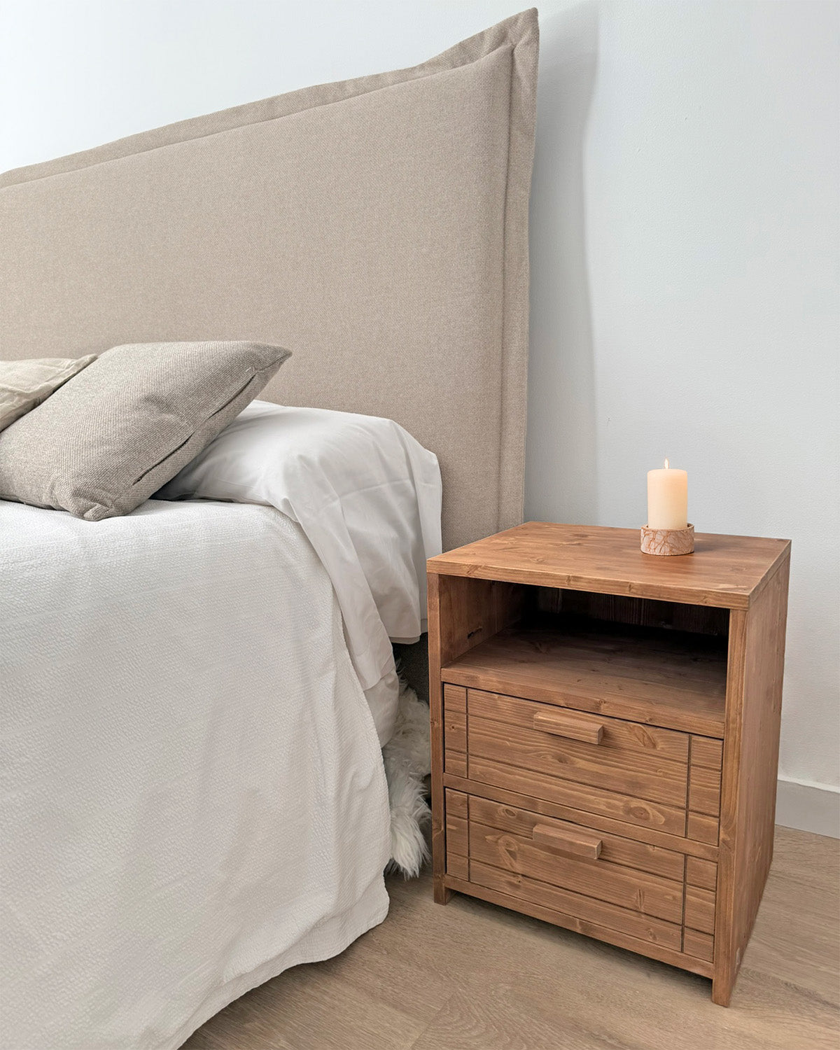 Este mueble de dormitorio no solo es un elemento decorativo para tu habitación, sino que también es muy funcional. Gracias a sus dos cajones espaciosos, nuestra mesita de noche Woody 2 cajones es perfecta para mantener el orden. El estante superior abierto ofrece un acceso fácil e inmediato a los objetos de uso diario, convirtiéndola también en una excelente mesa auxiliar para dormitorio.
